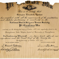 A certificate verifying Georgine Elizabeth Upshur’s membership in Pennsylvania University’s Delta Chapter of the National Social Science Honor Society of Pi Gamma Mu. The certificate is damaged at the top.
