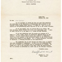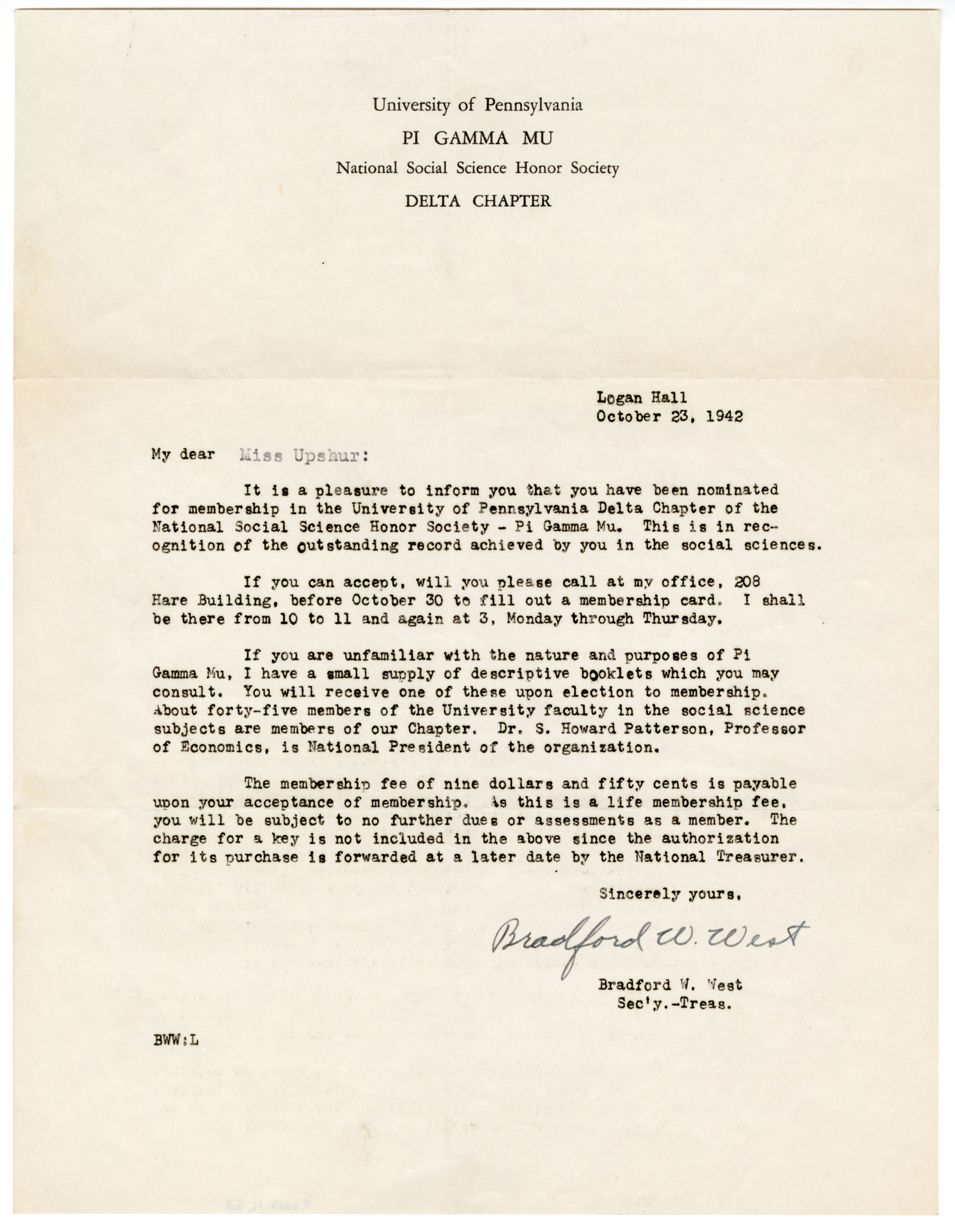 Letter to Georgine Upshur informing her of her nomination for membership in the University of Pennsylvania Delta Chapter of the National Social Science Honor Society – Pi Gamma Mu, October 23, 1942