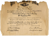 Pi Gamma Mu certificate issued to Georgine Elizabeth Upshur, October 31, 1942 A certificate verifying Georgine Elizabeth Upshur’s membership in Pennsylvania University’s Delta Chapter of the National Social Science Honor Society of Pi Gamma Mu. The certificate is damaged at the top. More information is available in the annotation of the document. -